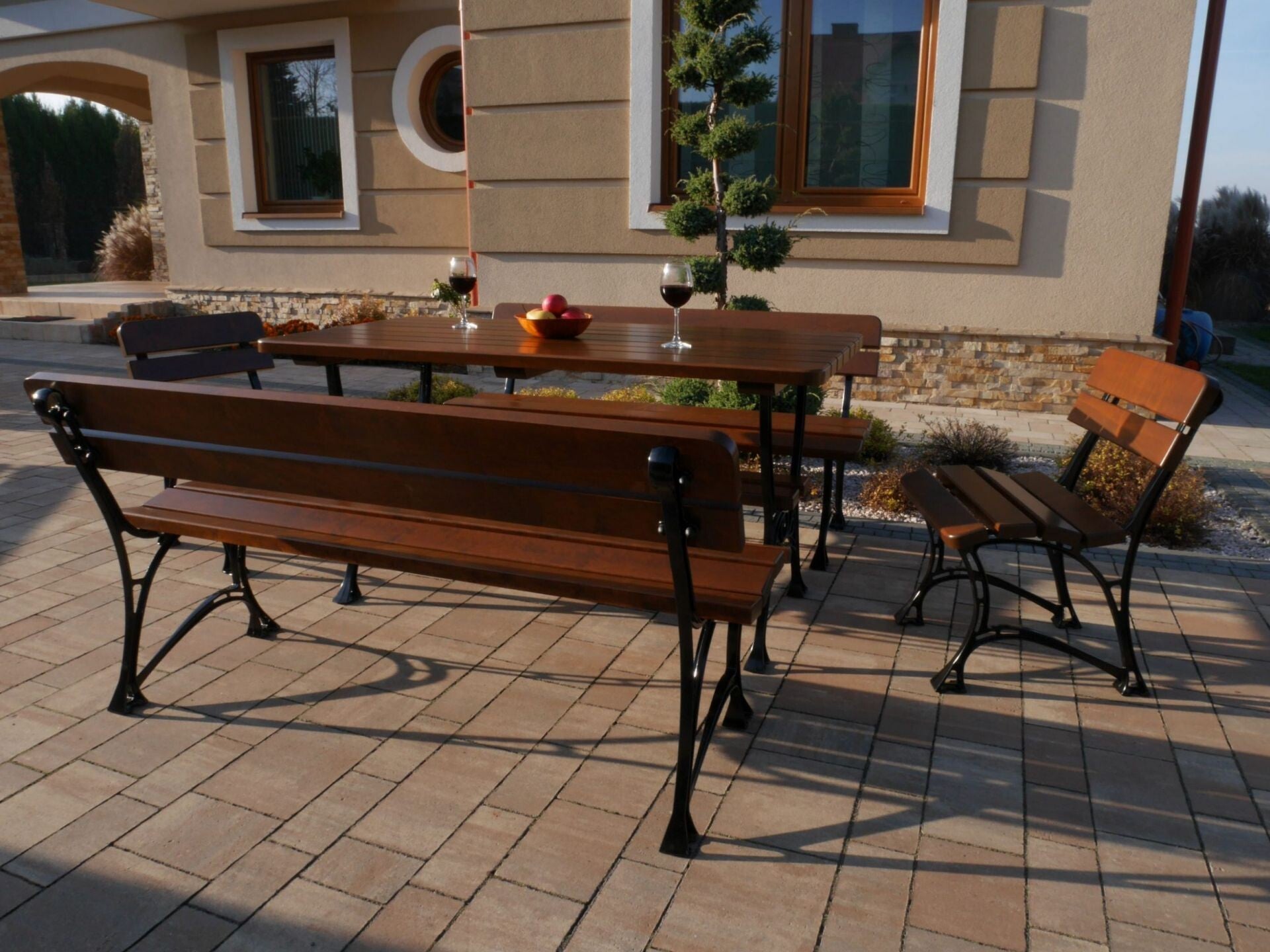 Komfortable und wetterbeständige Gartenmöbel aus Erlenholz mit Aluminiumrahmen, ausgelegt für acht Personen. Das Holz ist zweifach imprägniert, um Langlebigkeit zu gewährleisten.