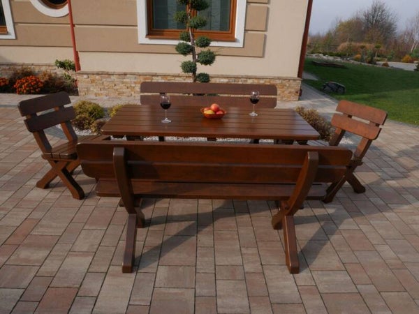 Terrassenmöbel aus Holz für eine sechsköpfige Familie. Das Möbelset, geeignet für Garten, Terrasse oder Restaurant, zeichnet sich durch stilvolles Design, bequeme Bedienung und hochwertige Verarbeitung aus. Die Kollektion umfasst einen 72 cm hohen Tisch, zwei Doppelbänke und zwei Stühle, die zusammen einen komfortablen Sitzplatz für acht Personen bieten. Dieses Set wird gerne in Biergärten und an Orten gewählt, an denen Grillpartys veranstaltet werden können.