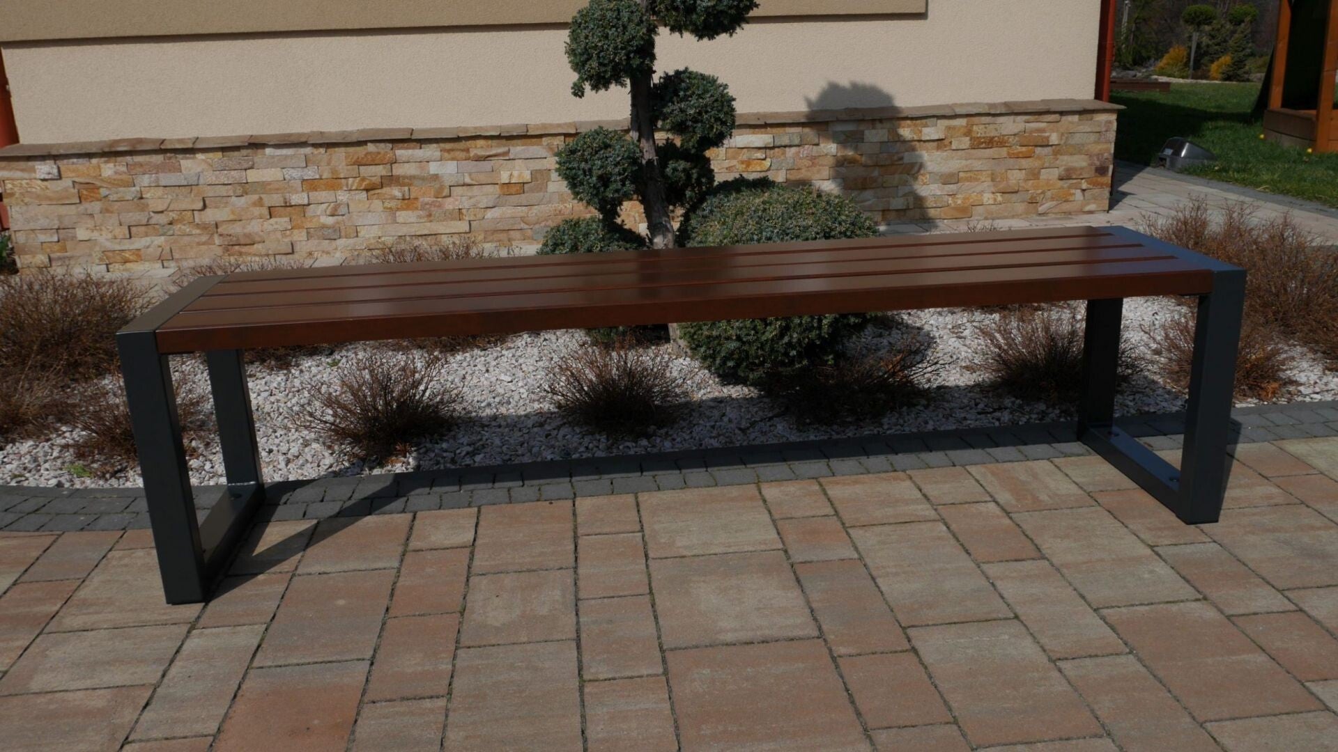 Holzmöbel mit modernem Design auf einer walnussfarbenen Stahlkonstruktion ohne Rückenlehne