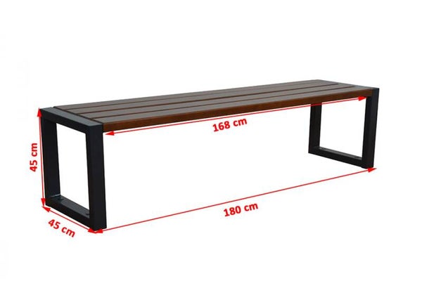 Produktbeschreibung: Holzmöbel mit modernem Design auf einer walnussfarbenen Stahlkonstruktion ohne Rückenlehne
