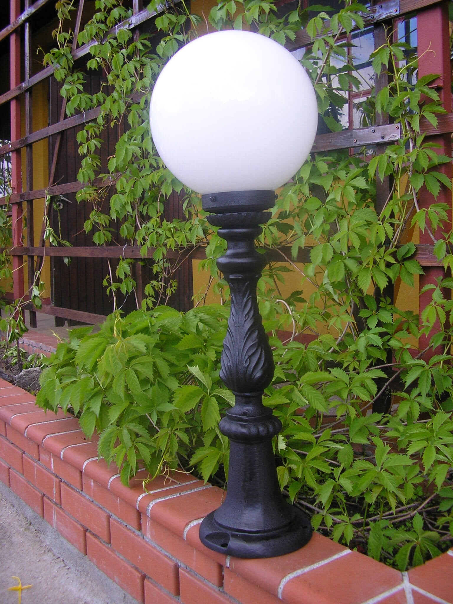 Stilvolle Außenleuchte mit Kugel für den Sockel, 72 cm Höhe. Die Lampe verfügt über Befestigungslöcher.