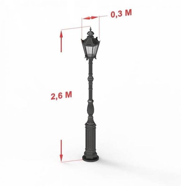 Gartenlampe aus Gusseisen mit strapazierfähigem Plexiglas, das die Glühbirne vor Nässe schützt. Die montierte Elektroinstallation ermöglicht einen einfachen Anschluss an das Stromnetz. Die Fassung ist für herkömmliche Glühbirnen mit E-27-Gewinde ausgelegt, was die Verwendung von Energiespar- oder LED-Lampen erlaubt. Die Lampe ist höhenverstellbar und kann auf jede gewünschte Höhe eingestellt werden. Die Abmessungen der GI-Lampe betragen 1x Laterne.