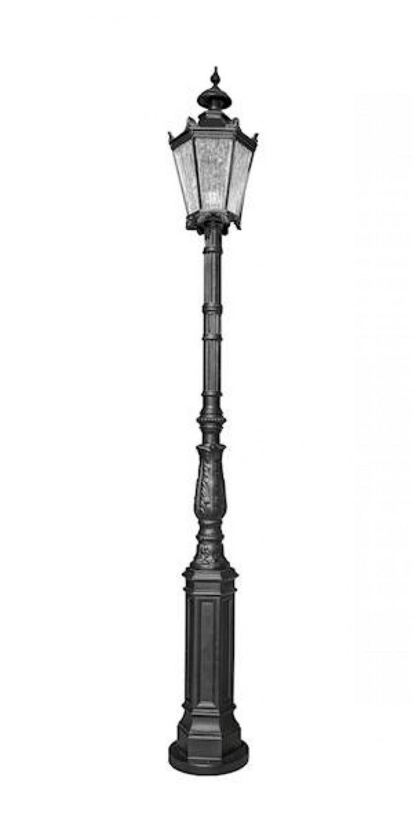 Gartenlampe aus Gusseisen mit strapazierfähigem Plexiglas, das die Glühbirne vor Nässe schützt. Die montierte Elektroinstallation ermöglicht einen einfachen Anschluss an das Stromnetz. Die Fassung ist für herkömmliche Glühbirnen mit E-27-Gewinde ausgelegt, was die Verwendung von Energiespar- oder LED-Lampen erlaubt. Die Lampe ist höhenverstellbar und kann auf jede gewünschte Höhe eingestellt werden. Die Abmessungen der GI-Lampe betragen 1x Laterne.
