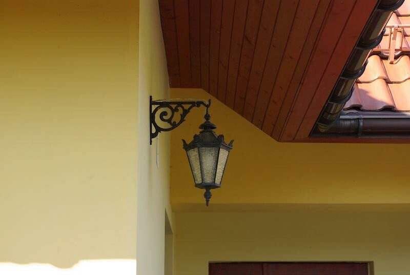 Produktbeschreibung: Laterne oder Lampe an der Vorderwand eines Hauses H 49 cm