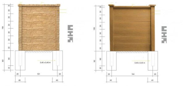 Betonzaun mit doppelseitiger Stein- oder Brettstruktur H 155 cm