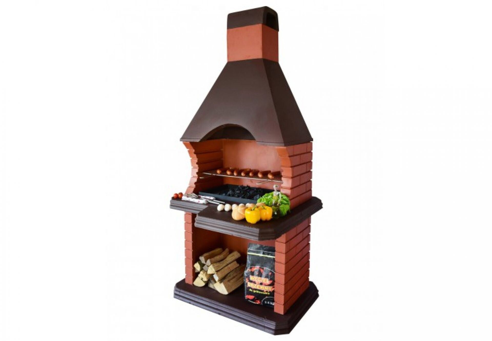 - Ein sorgfältig gefertigter Grill, der in Ziegelrot und Braun gestrichen ist.