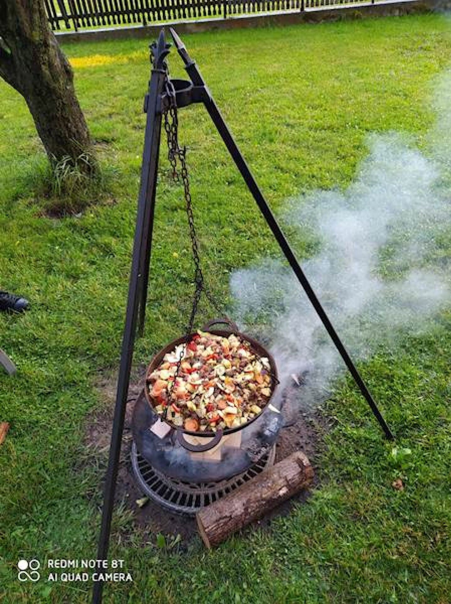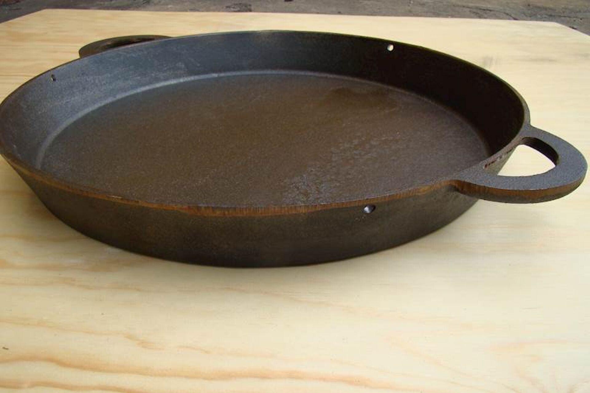 Auf Wunsch des Kunden können drei Löcher in die Pfanne gebohrt werden, damit sie über einem Feuerplatz aufgehängt werden kann.