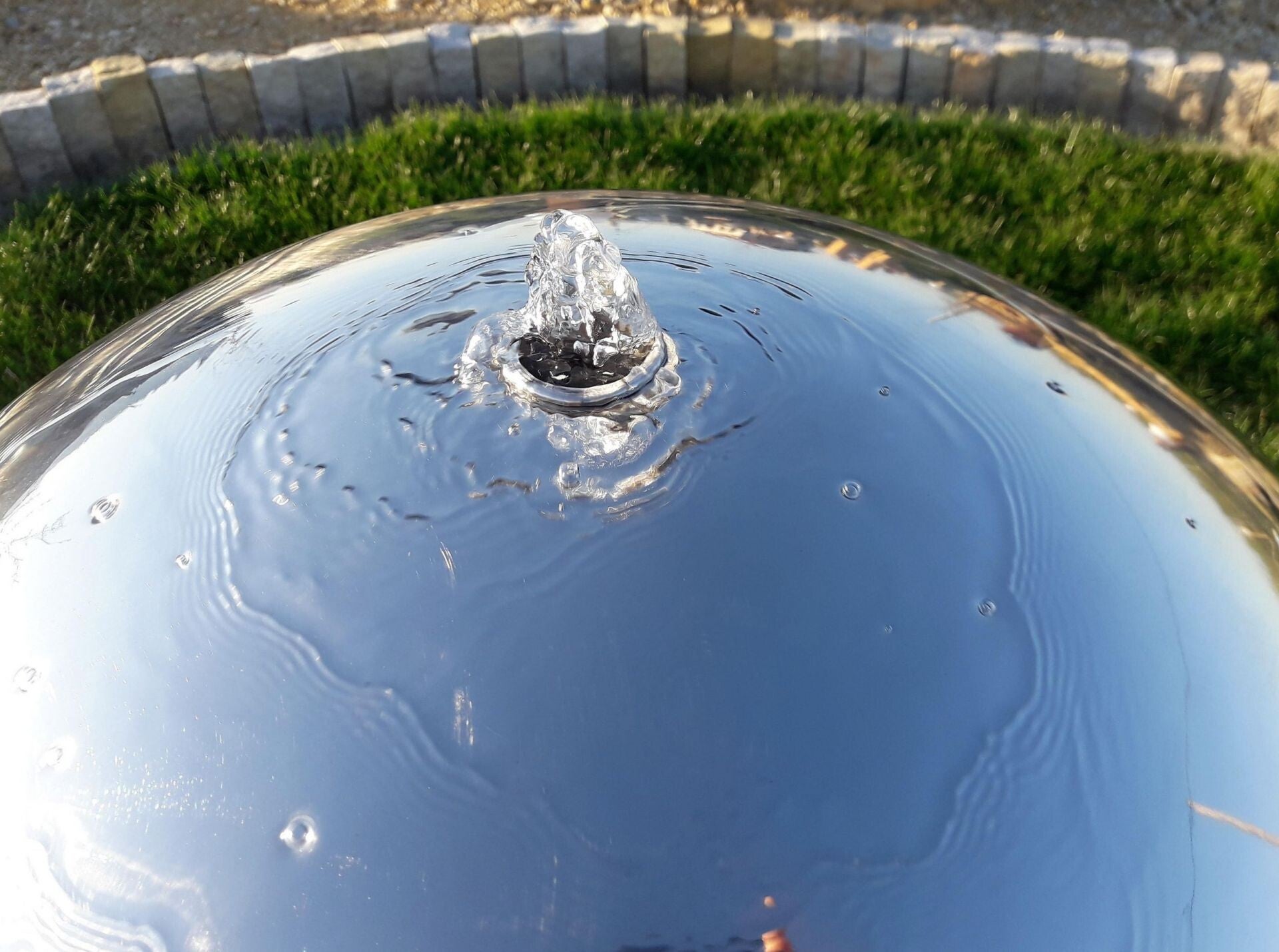 Produktbeschreibung: Set aus einem Edelstahlbrunnen mit 3 Kugeln mit Durchmessern von 38 cm, 48 cm und 58 cm Matte Kugel