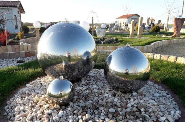 Edelstahl-Brunnenset bestehend aus drei matten Kugeln mit Durchmessern von 38/58/73 cm Kugeln