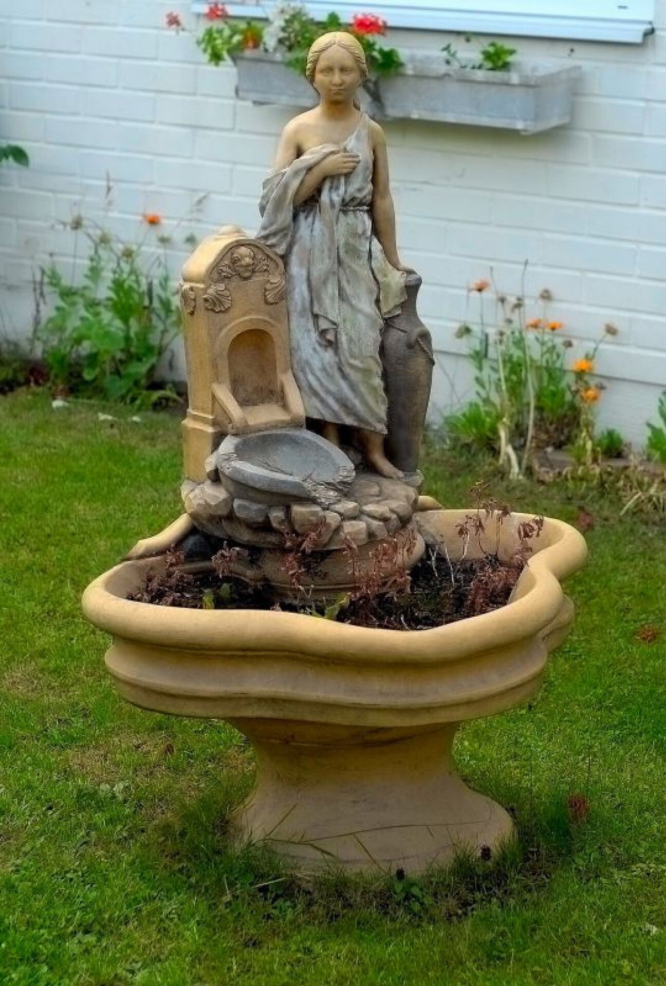 Eine anmutige Skulptur einer Frau, die neben einem Brunnen steht und Wasser gießt, verleiht diesem Brunnen einen besonderen Charme. Die dreiblättrige Kleeblatt-Schale krönt diesen subtilen Innen-/Außenbrunnen. Aufgrund seiner zarten Form, die unvergessen bleibt, wird das Produkt für den Einsatz in Gewerbe- und Dienstleistungseinrichtungen im Innenbereich empfohlen. Die Montage des Produkts gestaltet sich äußerst einfach.